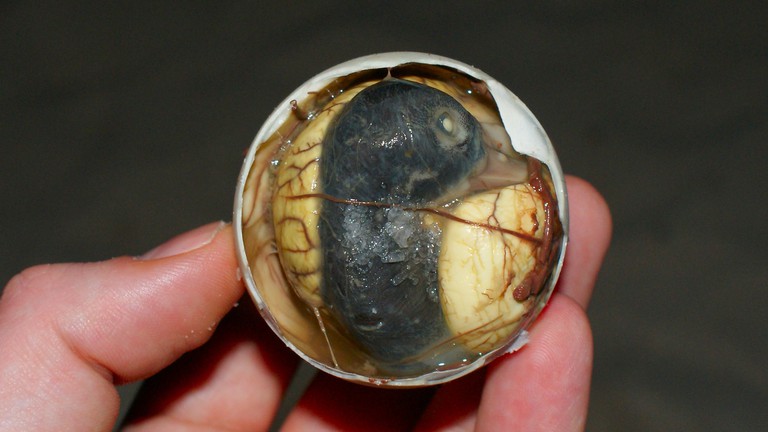 Every culture has a culinary specialty that raises the eyebrows—if not the gorges—of people from other cultures. Malaysian have Durians. France have smelly cheese, Filipinos have Balut, a hard-boiled duck egg. It sounds innocent enough, until you find out the egg is fertilized and allowed to develop from 16 to 20 days before it’s cooked. By this point, the embryo will have become distinctly duck like, sometimes complete with body parts like eyes, beaks, and feathers. You are essentially eating a duck fetus in uterus.